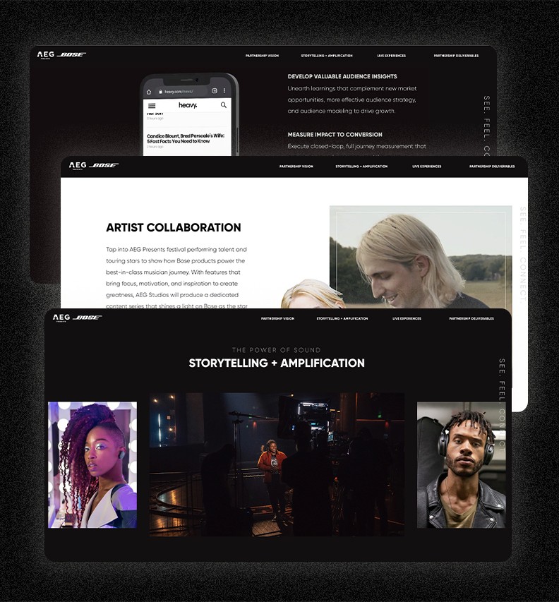 In 2022, Bose wanted to change their approach with consumers in the premium audio space by creating a tangible connection between music lovers at live events and Bose's innovative sound products. Responding to their brand brief, I strategized, wrote, and designed an interactive microsite pitch to connect the brand with younger, music-savvy audiences through AEG Presents festivals. The campaign concept included artist collaborations, immersive on-site audio experiences, and exclusive branded merchandise.